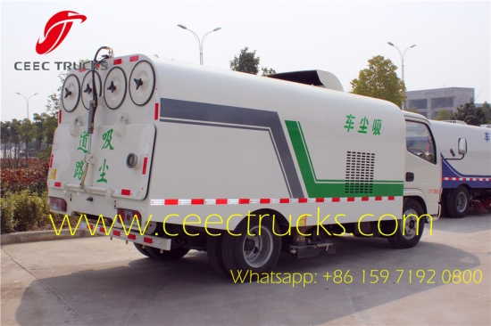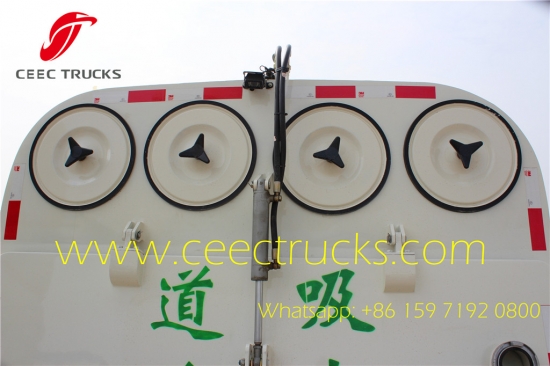 The CEEC TRUCKS produced dongfeng 5CBM Vacuum Suction road sweeper truck is composed by chassis, auxiliary engine, air blower, magnetic valve, debris bin, water bin, sweeping system, suction system, water sprinkling system, hydraulic system, electrical control system, etc.